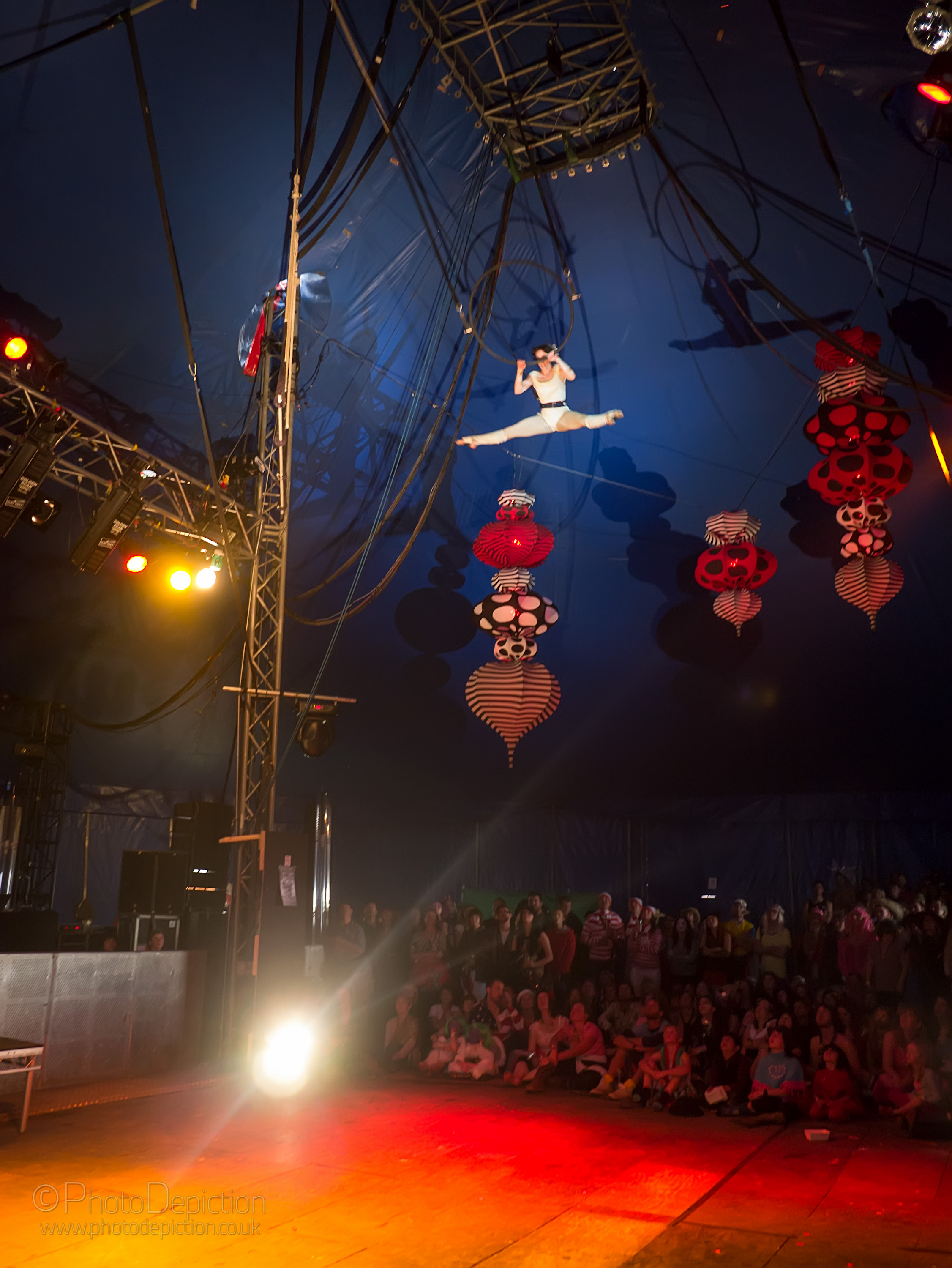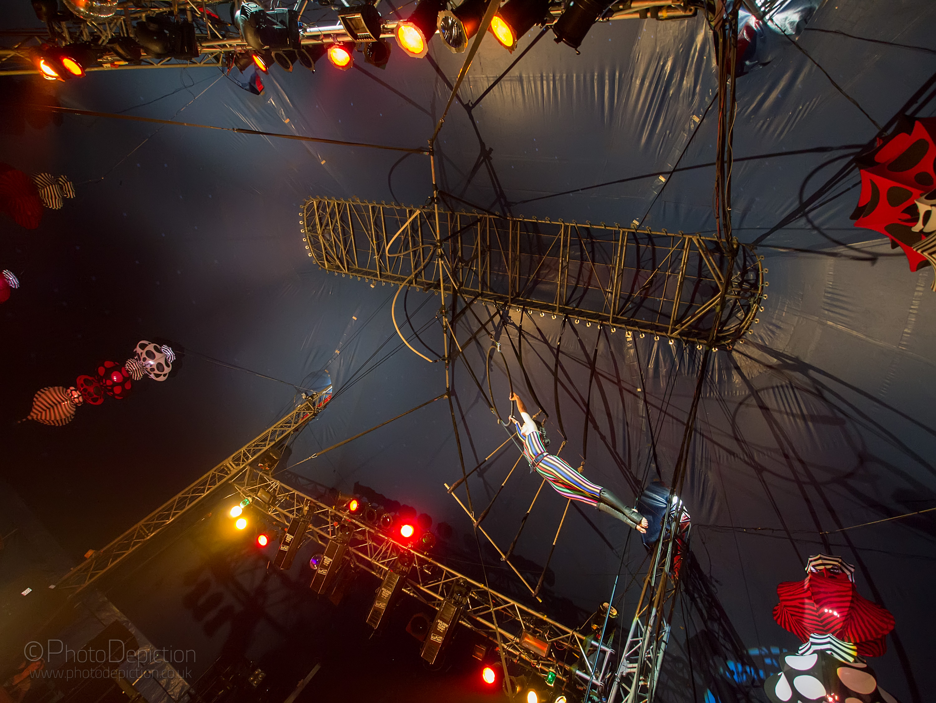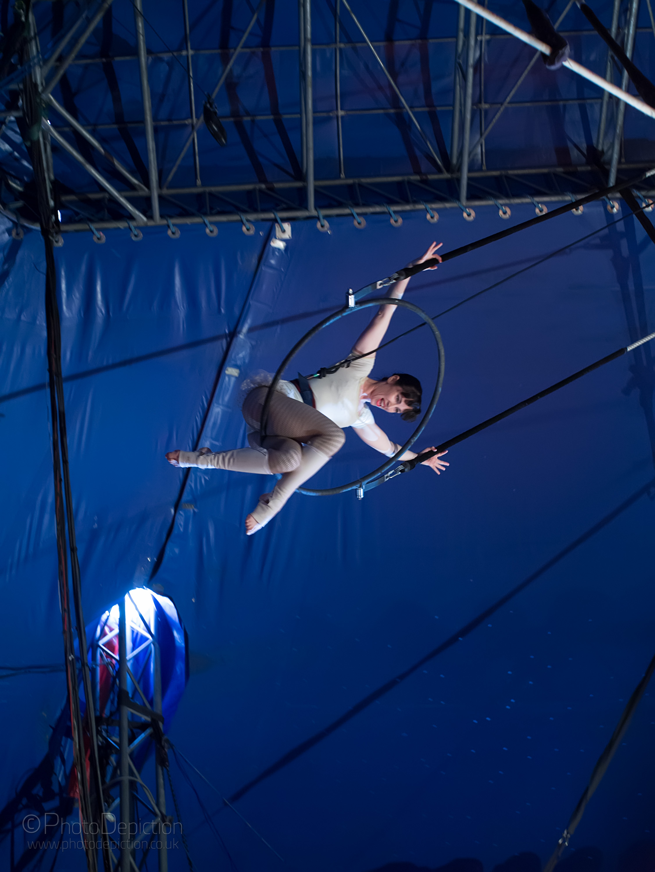 Using the rotating hoop, this is a swinging act with a twist! The hoop is fixed from side bearings allowing it to turn over as the aerialist swings through the air. Breathtaking somersaults and dives whilst in contact with the equipment, and fluid moments of flight make a thrilling and visually pleasing act.